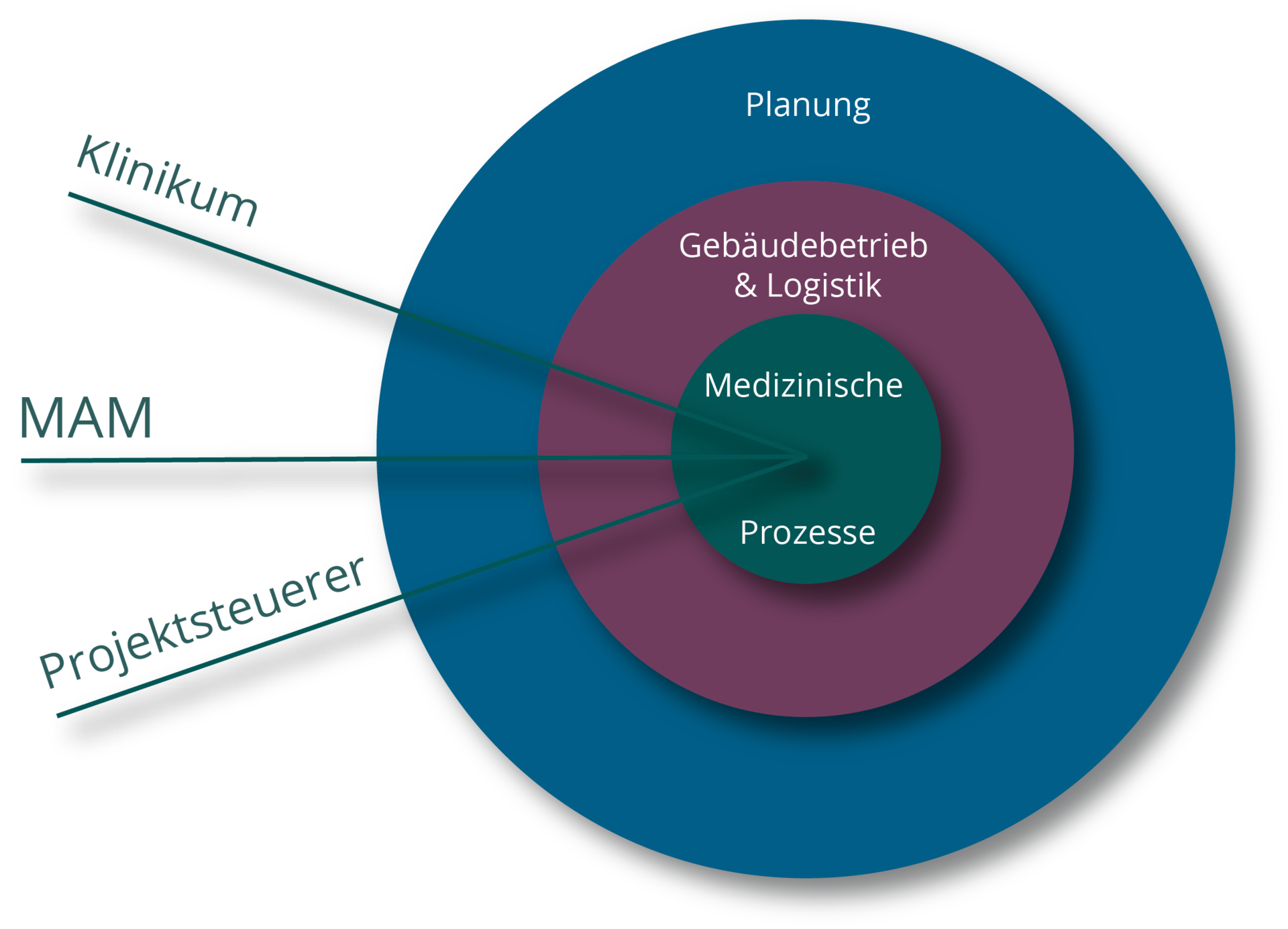 MAM bietet Ihnen mit der Projektbegleitung eine Schnittstelle zwischen BO-Planung, Bedarfsplanung, Zielplanung und der baulichen Realisierung. Wir verstehen uns als Bindeglied zwischen Medizin und Architektur und ermöglichen Kontinuität über den gesamten Projektverlauf. Hier setzen wir uns von der klassischen Projektsteuerung ab, denn den Fokus auf medizinisch-funktionale Qualität kann nur ein Bedarfsplaner wie Mehrwert Architektur & Management leisten.